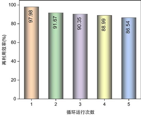 吸附劑的可重復(fù)使用性和吸附穩(wěn)定性在評(píng)估所開發(fā)方法的實(shí)際適用性方面起著至關(guān)重要的作用。事實(shí)上,吸附劑的可重復(fù)使用性能是實(shí)際應(yīng)用的首要標(biāo)準(zhǔn),并影響吸附過程的總體成本。活性炭苯蒸汽吸附的再利用效率是在五個(gè)連續(xù)的回收循環(huán)后確定的。如圖4所示,經(jīng)過五次連續(xù)回收過程后,活性炭苯蒸氣的再利用效率為86.54%。強(qiáng)大的可重復(fù)使用性和吸附穩(wěn)定性表明活性炭吸附劑和苯吸附物之間存在范德華力或π-π相互作用。相反,不完全的再生過程可歸因于吸附表面上永久鍵的形成,導(dǎo)致吸附基團(tuán)的不可逆轉(zhuǎn)化。換句話說,一些在再生過程中未解吸的化學(xué)結(jié)合吸附物可能會(huì)堵塞孔隙,導(dǎo)致殘留物形成。