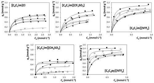 得到的結(jié)果表明,活性炭的不同的吸附能力與IL的性質(zhì)和溶液中的鹽量有關(guān)。一般而言,對(duì)于咪唑鎓的ILs,陰離子對(duì)其對(duì)活性炭的吸附能力的影響按照以下順序:Cl - ≈[CH 3 SO] <[CF 3 SO 3 ] -<[NTf 2 ] 。這一趨勢的結(jié)果和預(yù)計(jì)的相符合,并且表明,隨著陰離子疏水性的增加,活性炭對(duì)ILs的吸附逐漸增加。另一方面,考慮到IL陽離子家族,活性炭能吸附更多的吡啶鎓比基于咪唑類的對(duì)應(yīng)物?傊,這里證明,如果伴隨使用無機(jī)鹽來促進(jìn)鹽析現(xiàn)象并增強(qiáng)隔離度,則活性炭也可以用作水介質(zhì)中低濃度存在的親水性IL的有效吸附劑。得到的結(jié)果表明, 在鹽的存在下,親水性ILs的例如[C 4 C 1 im] Cl和[C 4 C 1 im] [CH 3 SO3 ]的K d值增加高達(dá)5.5倍。這種新方法可以被設(shè)想為減少由使用IL的工業(yè)過程產(chǎn)生的含水物流污染的有希望的途徑。