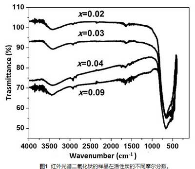 圖1示出了TiO 2的樣品的紅外光譜在活性炭的不同摩爾分?jǐn)?shù)。對于浸軟的手動獲得的化合物,譜圖顯示在3440cm -1處的譜帶,這與H-OH振動模式應(yīng)力相關(guān)聯(lián),并且透射率或紅外吸收碳隨著濃度的降低而增加。由于活性炭的存在,在2908cm -1處發(fā)現(xiàn)了由于芳香族基團(tuán)的CH鍵而形成的譜帶,觀察到該譜帶通過降低碳含量而急劇下降。1630cm -1處的帶對應(yīng)于水彎曲模式。具體看1000到400厘米-1寬帶被定義為活性碳含量增加。該區(qū)域的特征譜帶位于680 cm -1處,可與官能團(tuán)Ti-O-Ti和官能團(tuán)Ti-O的振動模式相關(guān)聯(lián)。通常,在圖1中觀察到強(qiáng)度隨著活性炭含量的降低而增加,這表明在低的碳摩爾分?jǐn)?shù)下各種結(jié)合的形成更強(qiáng)。
