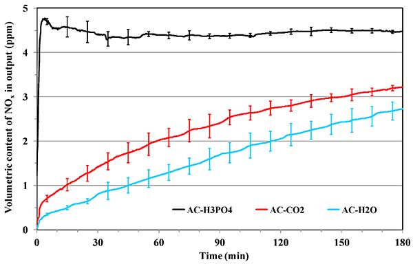 盡管用于汽車和工業(yè)廢氣都實施了減排措施,城市人口與車輛的增加導(dǎo)致了更多氮氧化物的排放。使用木質(zhì)纖維為前體制造的活性炭在環(huán)境溫度去除氮氧化物。這些活性炭吸附劑表現(xiàn)出令人感興趣的吸附容量范圍在40mg/g和120mg/g之間。然而,這些活性炭的性能通常在干燥和潮濕條件下在空氣存在下在500-1000ppmNO濃度下進(jìn)行評估。