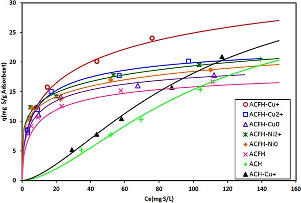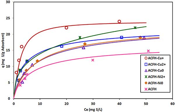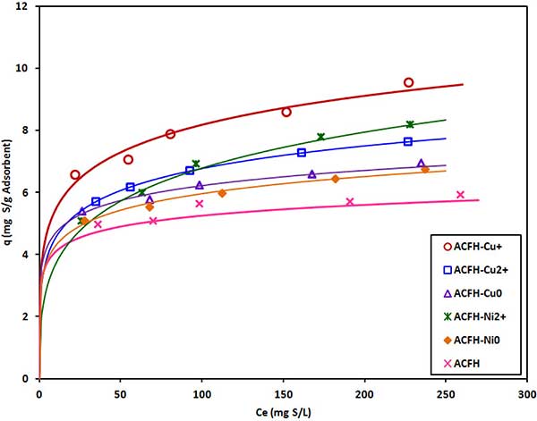 BT,DBT和4,6-DMDBT在浸漬有不同銅或鎳物種的活性炭纖維上的吸附等溫線如圖1,圖2和圖3所示。將實驗吸附數(shù)據(jù)擬合到LF模型并繪制以顯示這些圖中的整體等溫線趨勢。大部分吸附劑的吸附數(shù)據(jù)符合LF模型,相關系數(shù)大于0.94。與活性炭纖維等溫線不同,兩種介孔活性炭和ACH-Cu +的 DBT等溫線碳含量較低,相關系數(shù)分別為0.81和0.86。在低濃度(<50mg S / L)下觀察到的微孔活性炭纖維的較高吸附親和力是由于DBT在高能超微孔中的吸附所致;钚蕴坷w維等溫線也類似于標準I型等溫線。然而,對于中孔活性炭,觀察到等溫線的線性趨勢,表明在測試濃度范圍內具有相似的吸附親和力。盡管微孔碳在〜200mg S / L的平衡濃度下達到其最大TC容量,但是兩種測試的活性炭在較高濃度(>200mg S / L)下預計具有更高的容量。我們的結果表明,銅或鎳浸漬提高了活性炭的吸附能力。然而,這項研究量化了不同單個金屬物種對噻吩類化合物吸附的重要性。這項工作的一個具體的方法中,對吸附劑(所述金屬浸漬之前)到高溫氫還原除去活性炭的酸性氧官能團。因此,可能作出的貢獻的氧酸性基團可以排除在外。所有活性炭纖維具有相似的微孔性和可比的超微孔性。因此,活性炭對噻吩類化合物的吸附增強主要歸因于特定負載的銅和鎳物質的影響。