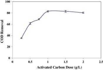 氧化處理后產(chǎn)生的污水仍然含有相當(dāng)數(shù)量的有機(jī)物,如COD殘留值(470 mg / L)。因此,采用后處理方法,通過使用活性炭,從處理后的廢水流出物中除去殘留的有機(jī)物質(zhì)。活性炭從處理過的流出物中吸附有機(jī)化合物可能是由于溶質(zhì)的疏水性。