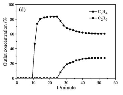在圖1中可以看出乙烯和乙烷在最初的幾分鐘內(nèi)完全被吸附,但乙烷在8分鐘后穿過(guò)管柱。在最初的25分鐘內(nèi),吸附劑保留乙烯,出口物流不含乙烯,然后再通過(guò)。最后,50分鐘后出口氣體濃度返回到進(jìn)料氣體濃度,表明該吸附劑樣品飽和。乙烯的吸附量是通過(guò)整合相關(guān)穿透曲線獲得的。
