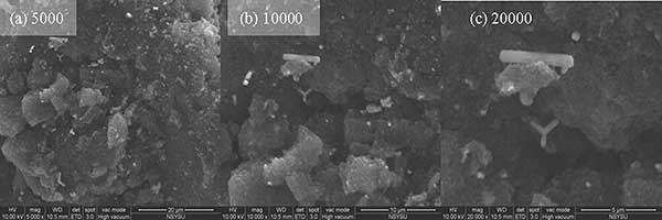 硫浸漬活性炭由大量微孔組成,高硫含量增強(qiáng)了活性炭對(duì)氯化汞的吸附能力。微孔通常具有大部分HgCl2吸附的活性位點(diǎn),而大孔和中孔作為運(yùn)輸路線。圖21顯示了分別放大5000,10,000和20,000倍的硫浸漬活性炭的ESEM圖像。如圖1所示,主要在活性炭表面發(fā)現(xiàn)大于500的大孔,中孔和微孔隱藏在活性炭?jī)?nèi)部。在硫浸漬之后,硫分子可以擴(kuò)散并沉積在活性炭的微孔上,并且可能堵塞過(guò)渡路徑。