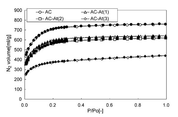 圖1.酸處理的活性炭的N2吸附/解吸等溫線:開(kāi)放:吸附,閉合:解吸。
