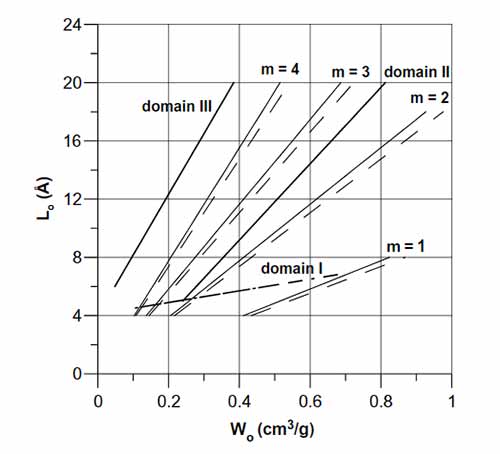 活性炭孔隙率遵循三個(gè)線性結(jié)構(gòu)域所示的常見趨勢。這一事實(shí)表明存在著由不同前體和精制路線的固體部分共同形成的共同形態(tài)。根據(jù)這些多孔固體的近期和各種已發(fā)表的特征,它們的孔壁由基本結(jié)構(gòu)單元的空間排列構(gòu)成,所述基本結(jié)構(gòu)單元由層疊的石墨烯層組成。為了減少模型中的參數(shù)數(shù)量,結(jié)構(gòu)被描述為圓盤狀顆粒,其直徑的特征在于石墨烯層中涉及的苯環(huán)的數(shù)量,并且其厚度由堆疊層的數(shù)量和層間距離。用于工業(yè)宏觀尺寸盤狀顆粒堆積的可用經(jīng)驗(yàn)相關(guān)性已經(jīng)應(yīng)用于那些納米級結(jié)構(gòu),導(dǎo)致在chars和碳分子篩觀察到的實(shí)驗(yàn)微孔體積范圍內(nèi)的值。