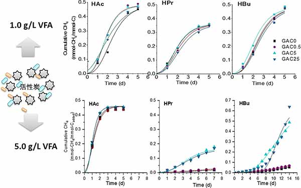 活性炭對生產(chǎn)甲烷的作用,活性炭可以促進(jìn)有機廢物產(chǎn)生甲烷,這個已經(jīng)有很多人研究證實過了。在本研究中,將不同的活性炭劑量0,0.5,5和25g/L添加到厭氧消化器中,并且分別表征乙酸鹽,丙酸鹽和丁酸鹽的產(chǎn)甲烷降解動力學(xué)。在5g/L的高有機負(fù)荷下,丙酸和丁酸的降解率在不同的活性炭劑量下增加1.5-4.7倍和2.5-7.0倍。甲烷生產(chǎn)率當(dāng)丙酸和丁酸的添加量增加到5g/L時顯著升高。然而,對于1g/L或5g/L的乙酸鹽降解,僅發(fā)現(xiàn)少量增加;钚蕴看龠M(jìn)丙酸鹽和丁酸鹽的協(xié)同降解的促進(jìn)機制可以主要歸因于對乙酸生成的觸發(fā)作用,正如互變細(xì)菌富集證明了這一點。