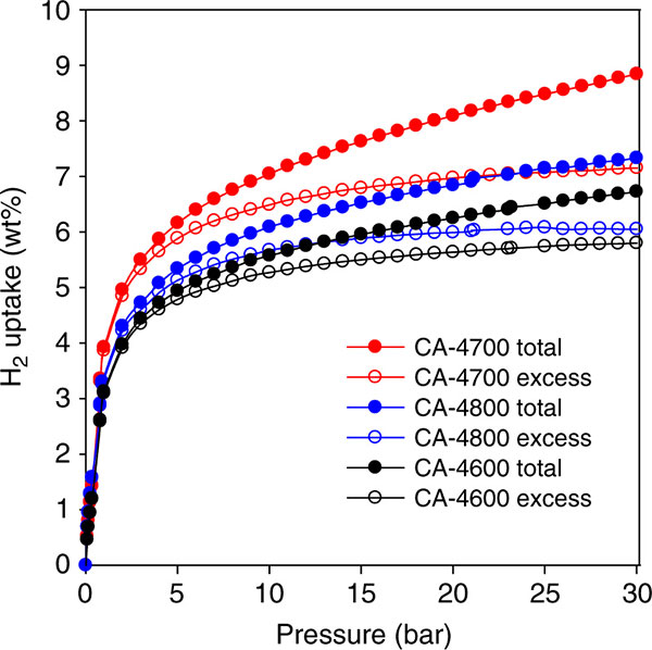 活性炭中的氫儲(chǔ)存需要具有最高表面積和適當(dāng)尺寸的孔的材料。在-196和25℃下使用重量法在HidenXEMIS分析儀上在0-30巴的壓力范圍內(nèi)研究活性炭的儲(chǔ)氫能力。圖2顯示了活性炭在-196℃下的過量和總氫吸收等溫線。對(duì)于所有CA-4T活性炭,氫吸收是可逆的,沒有滯后現(xiàn)象,并且在0-30巴的壓力范圍內(nèi)沒有達(dá)到飽和。我們首先注意到1巴的氫吸收非常令人印象深刻,在3.1-3.9wt%的范圍內(nèi)。這種儲(chǔ)氫比為高表面積活性炭傾向于在2-3重量%范圍內(nèi)的任何報(bào)告的值高得多。我們將這種特別高的吸收特性歸因于非常高的微孔表面積和富氧表面的組合,特別是對(duì)于3.9重量%的活性炭樣品CA-4700。富氧表面的效果是對(duì)于活性炭樣品CA-4600,其盡管具有適度總表面積和微孔表面,仍然表現(xiàn)出的吸收比以前發(fā)現(xiàn)的活性炭材料具有高得多的表面積。經(jīng)過研究發(fā)現(xiàn),具有氧官能團(tuán)的活性炭效果預(yù)期在低壓下具有最大效果,其中氫和表面之間的相互作用比在較高壓力下更重要,其中通過空間填充機(jī)制更可能發(fā)生氫吸收。