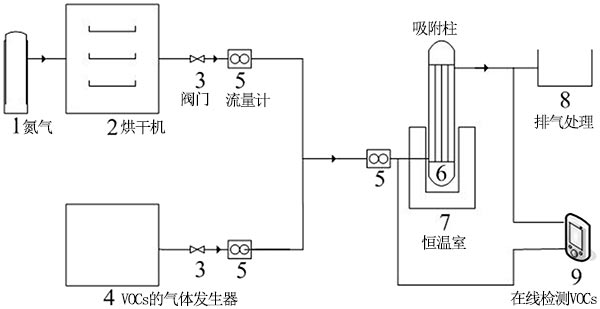 在吸附柱中研究了活性炭吸附甲苯的能力;钚蕴康挠昧繛10g,吸附質(zhì)甲苯氣體由氣體發(fā)生器產(chǎn)生。通過測(cè)定吸附前后甲苯的濃度,得到了不同條件下活性炭吸附性能的數(shù)據(jù)。實(shí)驗(yàn)吸附裝置的流程圖如圖2所示。將來自氣體發(fā)生器的甲苯氣體與氮?dú)饣旌,然后將其吸附在恒溫吸附塔中。通過在線FID檢測(cè)器測(cè)量吸附前后的甲苯含量,并通過流量計(jì)控制甲苯流量。當(dāng)脫氣和入口濃度在30分鐘內(nèi)保持一致時(shí),認(rèn)為已達(dá)到吸附平衡。吸附氣體通過廢氣出口排空。