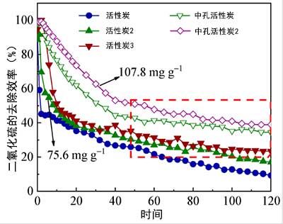 圖2.活性炭和中孔活性炭樣品的SO 2去除效率與時間的關(guān)系。