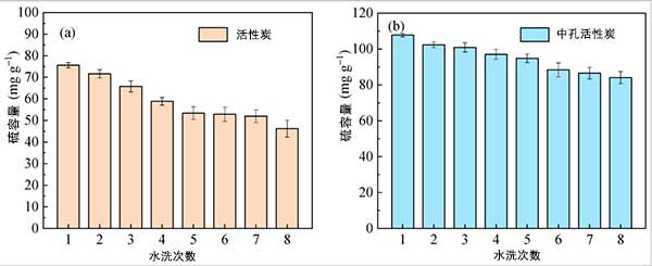 為了比較水洗再生對脫硫后活性炭樣品的影響,研究了硫容量與活性炭和中孔活性炭的循環(huán)次數(shù),如圖3所示;钚蕴康墓ぷ髁蛉萘靠傮w呈下降趨勢,第一次脫硫時為75.6 mg·g-1,第8次循環(huán)為46.2 mg·g-1,減少率為40.5%,如下圖所示。圖3a。結(jié)果表明,飽和吸附劑對H 2 SO 4的不完全解吸對循環(huán)SO 2有明顯的負面影響活性炭的吸附性能。用中孔活性炭觀察到類似的結(jié)果。然而,中孔活性炭的硫容量在8個循環(huán)后降低了22.0%,遠低于微孔活性炭的降低速率,這表明互連微孔和有序介孔的特性促進了H的解吸。2 SO 4并減少硫容量的減少。