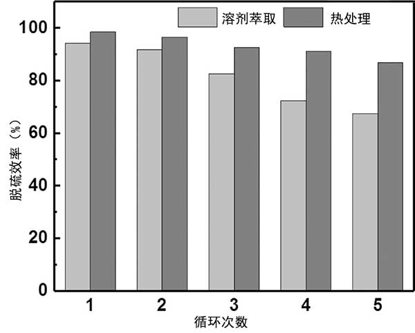 在吸附脫硫中使用的各種方法中,溶劑萃取和熱處理被認為是常用的再生方法。在這項實驗中,溶劑萃取和熱處理都用于研究活性炭的再生性能。關于溶劑萃取方法,在第一次吸附循環(huán)完成后,通過外部磁體收集活性炭,并通過添加甲醇作為萃取溶劑進行洗滌。然后,將活性炭干燥用于下一次運行。如在示出的圖3,它被發(fā)現(xiàn)的活性炭可在前兩次運行時通過溶劑洗滌輕松再生。這可能是因為物理吸附在吸附過程中占主導地位,并且由污染引起的大多數(shù)失活吸附劑可以通過溶劑萃取方法在初始循環(huán)中再生。然而,在連續(xù)五次再生操作后,吸附劑與新鮮吸附劑保持67%的初始脫硫效率(相當于20.22mg DBT/g)。隨著循環(huán)次數(shù)的增加,活性更高的位點與DBT相互作用,并且后一次運行留下的活性位點更少,從而導致隨后的再生運行中脫硫效率降低。為了提高活性炭吸附劑的再生效果,引入了熱處理方法。通過溶劑萃取再生后,將獲得的活性炭在氮氣氛下在350℃下活化1小時來恢復活性。
