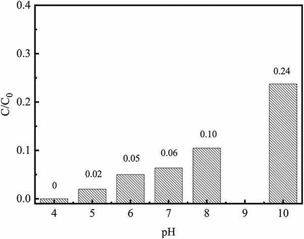 初始pH對(duì)鉻酸鹽去除能力的影響如圖3所示。發(fā)現(xiàn)鉻酸鹽的去除能力明顯受pH值在4.0-10.0范圍內(nèi)的影響。隨著溶液pH從4增加到10,鉻酸鹽去除率從100%下降到76%。在pH~4.0時(shí),HCrO 4是鉻酸鹽的主要形式。因此,在高溶液的pH值,使Cr之間的強(qiáng)烈競(jìng)爭(zhēng)羥基(OH)應(yīng)該是低鉻酸鹽去除能力的主要原因。此外,較低的pH可有助于去除無(wú)源氧化鐵層,活性炭復(fù)合材料的表面中含有納米零價(jià)鐵用于接觸周圍的Cr(vi)溶液。因此,在所有后續(xù)的程序?qū)r溶液的初始pH設(shè)定為4.0。