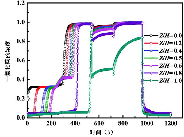 循環(huán)中活性炭床1上軸向CO濃度的變化在圖3顯示。在標記為Z/H的吸附床中精確定位7個測量點,分別為0.00,0.20,0.40,0.50,0.60,0.80和1.00,Z/H=0.00定義為吸附床的入口。從圖3中可以看出,在吸附步驟之后,吸附床處于Z/H=0.00-0.60達到CO吸附的飽和度。在ED步驟期間,一些雜質(zhì)氣體從吸附床排出,并且CO濃度略微增加。在更換步驟中,吸附床中的CO濃度逐漸增加,并且在更換步驟后,吸附床中的CO濃度高于98%,除了床出口,即在更換步驟結(jié)束時,吸附床在Z/H=1.00時,CO吸附飽和。因此,活性炭在合適條件下被充分利用。