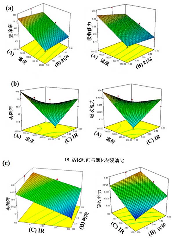 圖1:活性炭的(a)活化溫度和浸漬比(b)活化溫度和活化時(shí)間(c)浸漬比和活化時(shí)間,去除率和吸附能力對(duì)表面響應(yīng)曲線的影響。