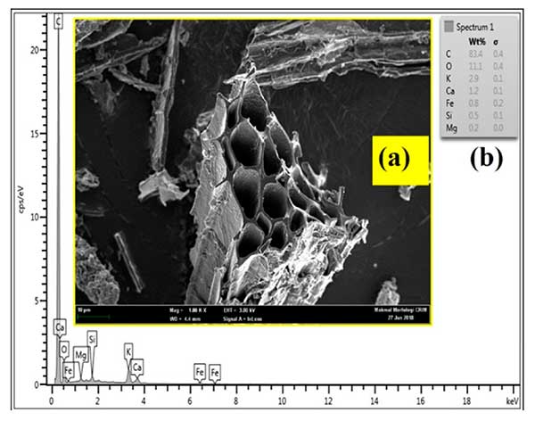 FESEM和EDX如圖2所示。FESEM用于研究活性炭的表面形態(tài)?讖椒植寂c孔隙大小具有相同的附屬關(guān)系,如圖2a,b所示。在顯微照片圖像中指出,圓柱狀管構(gòu)成所制備的活性炭的孔結(jié)構(gòu)。由黃麻和椰子纖維制成的活性炭反映了同樣的趨勢(shì)。此外,揭示了通過活化劑能在纖維表面上具有良好構(gòu)建和發(fā)展孔隙與高表面積。