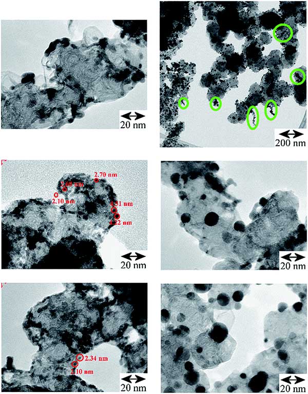 活性炭負(fù)載鈀催化劑的TEM比較顯示在圖1。左:原始活性炭,右頂部和中部:在300°C和底部:400°C下進(jìn)行碳熱處理后,這會導(dǎo)致活性炭的顆粒增長,但之后聚集體大部分缺失孤立的較大平均尺寸增大的鈀微晶留在活性炭表面。右上:在300℃處理后的活性炭負(fù)載鈀的調(diào)查圖像,其中的橢圓形綠色標(biāo)記突出顯示在400℃催化劑上不存在的殘余聚集體。顯示貴金屬實體的形狀,尺寸和形態(tài)之間的明顯差異。對于活性炭負(fù)載鈀,在多孔高表面積活性炭載體上/中存在大部分分離的初級顆粒。對于活性炭催化劑,主要存在線性聚集鏈和支化聚集體,在表面具有一些聚集體。熱處理導(dǎo)致大部分分離的初級顆粒尺寸增大,僅剩下少量聚集體或附聚物。