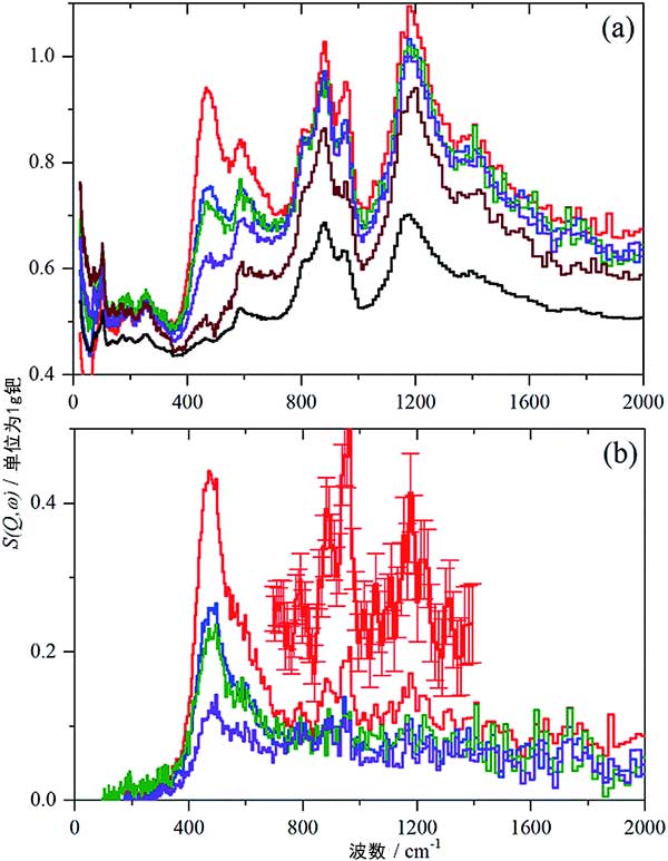 對于活性炭樣品中的每一個,氫氣在飽和壓力(700毫巴)下記錄IINS光譜,然后逐漸使每個活性炭脫氫,首先使其在室溫下脫氣不同時間并且然后在200°C下放置12小時。圖2顯示了標(biāo)準(zhǔn)化光譜活性炭和活性炭負(fù)載鈀的差異光譜,(a)記錄的標(biāo)準(zhǔn)化光譜,氫氣從上到下在700毫巴下,抽真空至9毫巴,抽空至3毫巴,在200℃下抽真空放置12小時,在200℃下第二次抽真空后放置12小時的活性炭。(b)減去在200℃下第二次抽空過夜的樣品后的差異光譜,從上到下:氫氣在700毫巴下,抽真空至9毫巴,抽真空至3毫巴,在200℃抽真空放置12小時后的活性炭負(fù)載鈀催化劑。