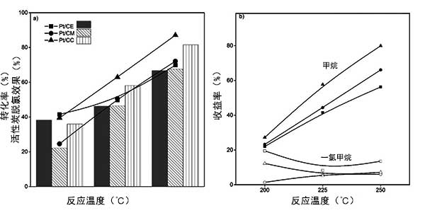 圖3:二氯甲烷(a)的初始轉(zhuǎn)化率和脫氯以及活性炭載鉑催化劑對甲烷和一氯甲烷(b)的收益率。