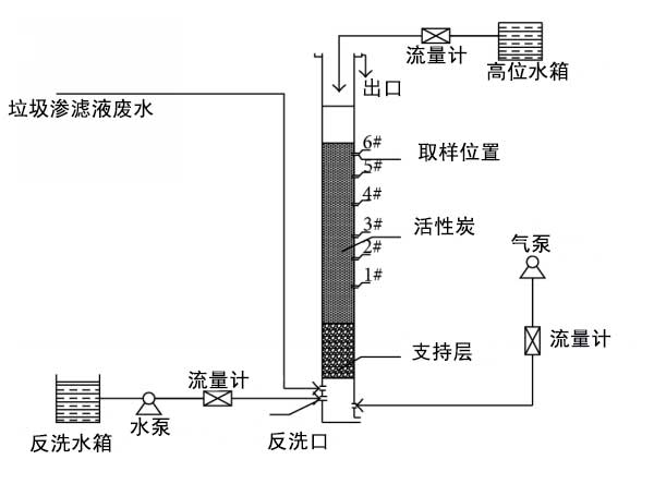活性炭反應(yīng)器工藝流程圖如圖1所示;钚蕴砍赜捎袡C(jī)玻璃制成,有機(jī)玻璃是柱式反應(yīng)器;钚蕴砍馗叨葹2米。內(nèi)徑為63毫米。填充高度為1800毫米。碳層高度為1500毫米。砂濾器高度為300毫米。反應(yīng)體積為4.7 L.有5個(gè)水取樣口和碳池。底部有曝氣器,碳池頂部有溢流堰。水質(zhì)分析指標(biāo)為紫外分光光度法和紫外分光光度計(jì)。
