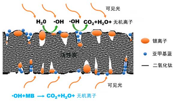 通過光催化降解再生活性炭具有很大的優(yōu)勢,因?yàn)榕c其他再生工藝如熱和化學(xué)處理,微生物再生,電化學(xué)方法和超臨界萃取相比,它具有成本低,二次污染少的特點(diǎn)。此外,光催化再生可以通過同時進(jìn)行光催化降解和吸附來實(shí)現(xiàn)活性炭的自再生。二氧化鈦(TiO 2)是一種高效的光催化劑,通常固定在活性炭上進(jìn)行再生。然而,TiO 2的光催化降解部分受到限制,因?yàn)樗哂袃蓚固有特性:(1)具有大的帶隙,TiO 2僅吸收UV光子,其僅占太陽光譜中能量的約5% ,(2)由于電荷載體的快速復(fù)合,TiO 2具有低的光催化活性。為了延長光響應(yīng)區(qū)域,貴金屬被摻入TiO 2中,包括金,銀和鉑。與金和鉑相比銀具有抗菌活性和低成本,因此具有更廣泛的應(yīng)用領(lǐng)域。