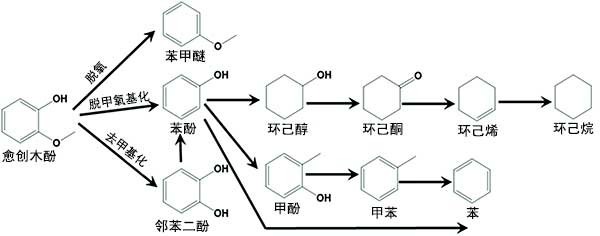 圖2:愈創(chuàng)木酚通過活性炭載鎳催化劑的加氫脫氧反應(yīng)。