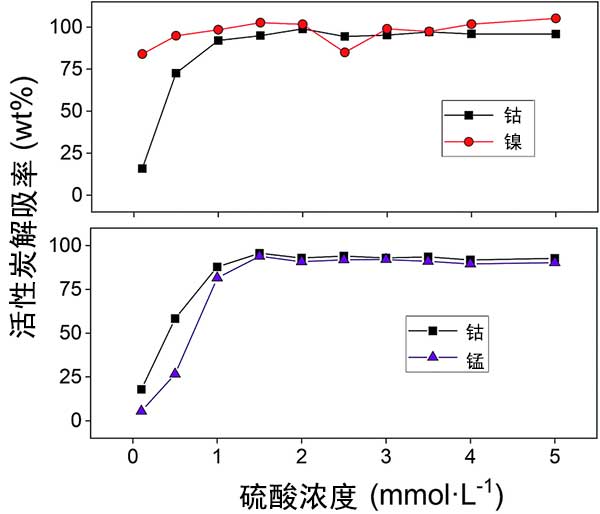 在使用活性炭成功吸附鈷之后,研究了用硫酸汽提以回收金屬離子并允許重復(fù)使用吸附劑。我們分別測試了三種回收參數(shù),實(shí)驗(yàn)發(fā)現(xiàn)低濃度的硫酸就足以去除大部分活性炭吸附的鈷(II),鎳(II)和錳(II)。由于僅有少量鎳(II)被吸附到活性炭上,因此解吸溶液中的鎳(II)濃度也很小。其結(jié)果是,對于鎳(II),元素分析的微小差異導(dǎo)致解吸百分比的相對大的差異,這可以在圖4中看出。