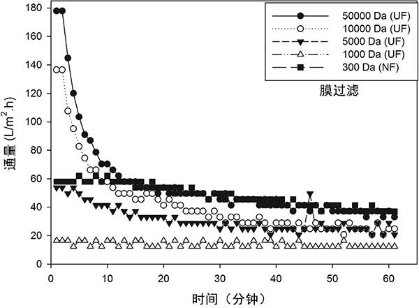 在膜過濾測試中,使用四個UF膜和一個NF膜。研究了1小時的通量變化,并監(jiān)測了降低的通量。在UF膜觀察到較高的通量降低。過濾1小時后,隨著截留分子量從50,000 Da減少到1,000 Da,通量下降也減少了。對于10,000 Da UF膜,在初始通量1小時過濾后損失了82%的通量。1,000 Da UF膜顯示出較低的通量在圖2顯示?讖绞怯绊懩み^濾通量的最重要參數之一,也是影響活性炭吸附能力的參數。通量也受膜結構,水中成分和廢水pH的影響。有些膜有很高的同量主要是由于膜表面與廢水成分之間的靜電相互作用。