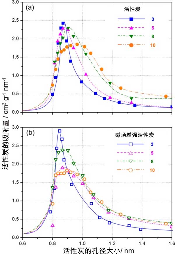 圖3:由(a)活性炭和(b)高磁場(chǎng)下制備活性炭的孔徑分布。