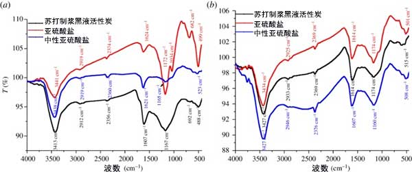 FTIR光譜和SEM在表面功能基團并根據該制漿工藝的研究基于活性炭的形態(tài)學的變化在圖2示出。關于FT-IR光譜(圖3a,b),很明顯活性炭的表面具有強帶,其分配為酚木質素,羧酸或吸附水的OH伸縮。因為蘇打制漿導致從原料中更高的二氧化硅去除,并且因此黑液中的二氧化硅含量更高。發(fā)現不同官能團為特征的活性炭表面已準備好進行吸附過程。