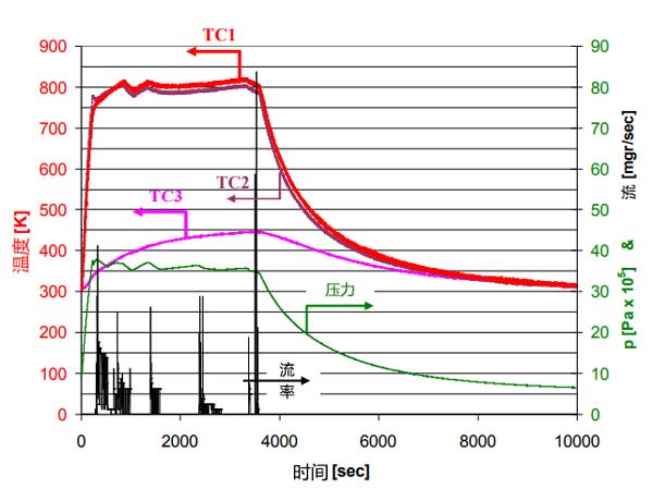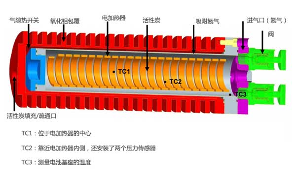 排出壓力約為3.5MPa的實驗結(jié)果如圖4所示。250秒后,加熱功率為500W,中心溫度超過476℃,而電池底座溫度則為76℃。然而,將電池達(dá)到其穩(wěn)態(tài)溫度分布需要大約60分鐘,其中電池基座中的溫度為166℃;钚蕴康臏囟炔辉试S超過526℃。 60分鐘,加熱功率逐漸降低,以保持最高溫度低于526℃,壓力高于3.5MPa。由于電池基座的溫升速率隨時間降低,輸送的氮量也減少了。因此,在15分鐘后結(jié)束放電階段僅從活性炭吸附池釋放4.6g氮。圖4中的冷卻階段持續(xù)約100分鐘,并且如果放電階段在15分鐘后結(jié)束(此時基礎(chǔ)溫度僅為126℃),則可以減少冷卻階段。活性炭中的加熱和冷卻速率以及溫度分布與數(shù)值分析估計的相似。這表明簡化的數(shù)值傳熱分析為吸附池中的傳熱提供了令人滿意的估計。