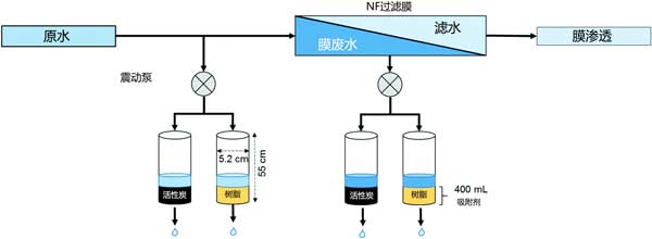圖1:使用兩個串聯(lián)的納濾膜處理全氟烷基物質(zhì)污染的原水的示意圖,產(chǎn)生過濾水和膜廢水。另外,使用活性炭或陰離子交換樹脂處理原水和膜廢水。