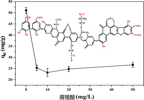 腐殖酸在通過死亡植物的微生物降解而衍生的天然水中普遍存在,其總是伴隨四溴雙酚A。因此,它的共存對(duì)四溴雙酚A的吸附效果是有影響的。根據(jù)四溴雙酚A在不同濃度腐殖酸下被活性炭吸附的結(jié)果(圖3),當(dāng)腐殖酸濃度小于10mg L-1時(shí),吸附容量顯著降低,而隨著腐殖酸濃度的持續(xù)增加,活性炭吸附四溴雙酚A增強(qiáng)。腐殖酸的基本結(jié)構(gòu)是芳香環(huán)和脂環(huán)環(huán),與羧基,羰基,醌基,羥基和甲氧基連接。所有這些結(jié)構(gòu)都可以形成π-π相互作用,與活性炭形成氫鍵,這可能是由于腐殖酸和四溴雙酚A在活性炭上的競(jìng)爭(zhēng)性吸附,從而降低了四溴雙酚A的去除效率。高濃度腐殖酸吸附的輕微增加可能是由于游離四溴雙酚A吸附到吸附到活性炭表面的腐殖酸。
