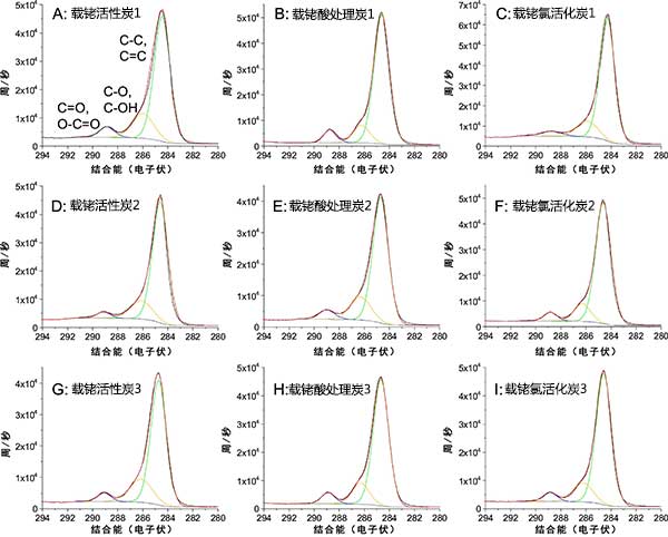 在我們的案例中,我們對所有9種活性炭催化劑進行了詳細的X射線光電子能譜分析。但是,我們應(yīng)該注意到,就表面原子組成而言,沒有檢測到信號。我們將此結(jié)果歸因于銠的固有低信號,并且我們的銠中心極其分散在我們的碳基質(zhì)中,反過來非常低的暴露金屬部分用于有意義的檢測,X射線粉末衍射儀分析也證實了這一點。