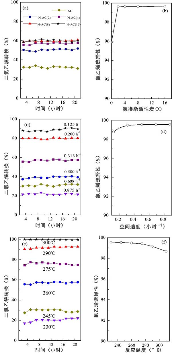 c、顯示出二氯乙烷轉(zhuǎn)換為初始?xì)涞囊话,而氯乙烯選擇性是在任何時候都在99%以上。結(jié)果表明氮摻雜活性炭催化劑具有良好的穩(wěn)定性。