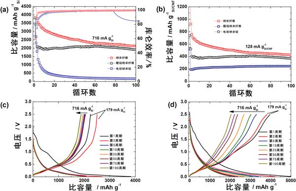 如圖4所示,從第一個(gè)循環(huán)的電壓分布中看出,兩個(gè)陽極的第一個(gè)循環(huán)的額外貢獻(xiàn)來自不可逆的固體電解質(zhì)界面層形成和電解質(zhì)分解。對(duì)于電化學(xué)表征,在紐扣電池配置中使用鋰金屬作為對(duì)電極對(duì)所有硅陽極進(jìn)行恒電流充電和放電。裸露的十億分之一硅陽極在第一個(gè)循環(huán)中提供3445mAhg的放電容量,庫(kù)侖效率約為65%。從第二個(gè)循環(huán)開始,二氧化硅的硅載納米纖維陰極的比容量值急劇下降至2600mAhg,而納米纖維的靜電紡絲陽極顯示出邊際下降,比容量為4000mAhg-1,庫(kù)侖效率均為約91%。比容量的急劇下降可歸因于二氧化硅的硅載納米纖維中的二氧化硅殼在第一次循環(huán)中不可逆鋰化。