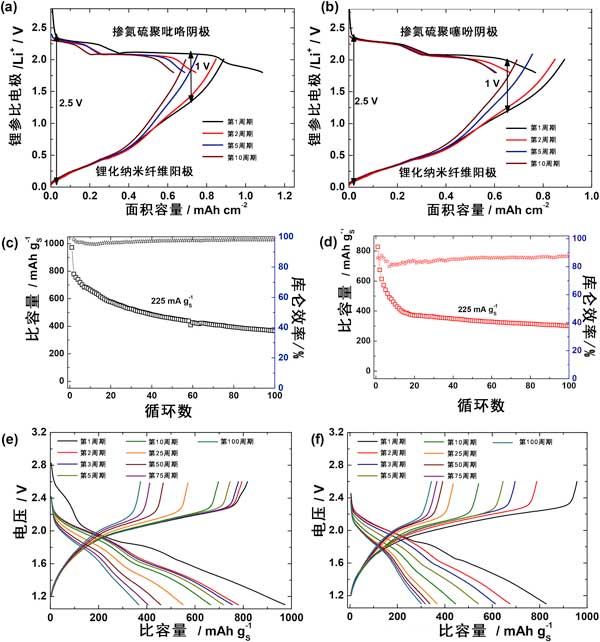 為了證明設(shè)計(jì)單個(gè)電極的可行性和相關(guān)性,用鋰化硅/納米纖維陽極代替金屬鋰以實(shí)現(xiàn)0.鋰-硅/硫全電池。為此目的,陰極和陽極都應(yīng)在半電池測(cè)試中實(shí)際實(shí)現(xiàn)的面積容量方面進(jìn)行平衡。在全電池配置中,硅陽極的脫鋰與硫陰極的鋰化密切相關(guān)。換句話說,硫陰極的放電將遵循硅陽極脫鋰的潛在和容量分布。