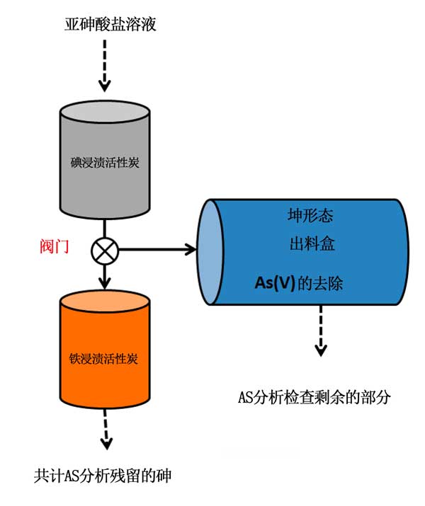 將5ml直徑為1.2cm的注射器裝入3cc的碘浸漬活性炭,以形成2.5cm長的填充柱。將棉濾器置于柱的末端,以避免活性炭的損失。使用設定為10ml/分的蠕動泵,將50mg/L砷溶液從頂部到底部連續(xù)地在柱中流動。溶液通過柱子,從底部噴嘴排出,并以150ml的份數(shù)收集,用于定期pH監(jiān)測。此外,在完成每次150ml的回收之后,從塑料小瓶中的噴嘴取出從柱中排出的下列1ml溶液用于砷化學分析。當50mg/L砷溶液的氧化效率低于90%(意味著砷酸鹽濃度低于45mg/L)時,停止試驗。