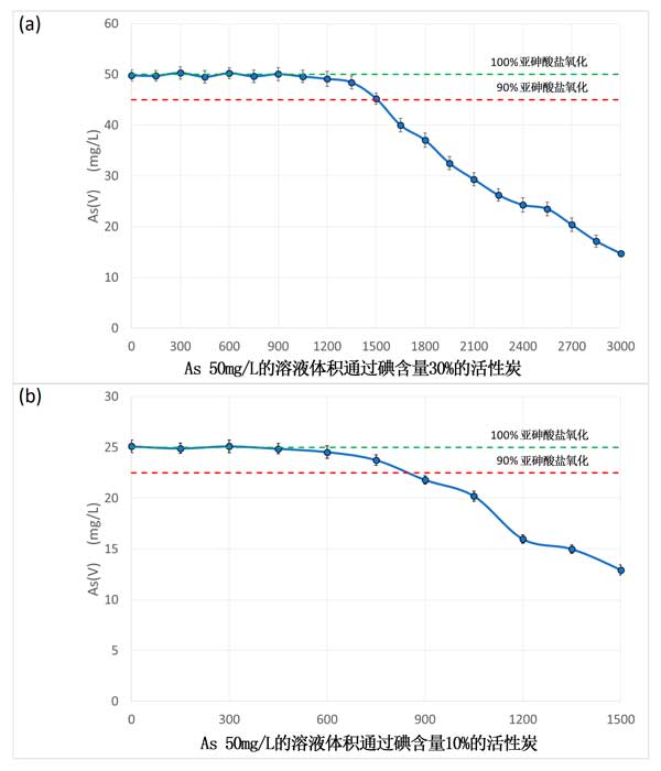我們的柱實驗可以被認為是一種壓力測試,因為亞砷酸鹽的含量遠遠高于天然水中常見的濃度。也使用如此高的濃度以不過度延長實驗時間。在基于蒸餾水的實驗中,并且使用碘浸漬活性炭,測得砷的氧化效率大于90%直至1.5L被氧化,并且在對于1cc碘浸漬活性炭,氧化能力為約25mg砷。之后,氧化效率逐漸降低,在2.5L左右下降至低于50%(圖3a)。