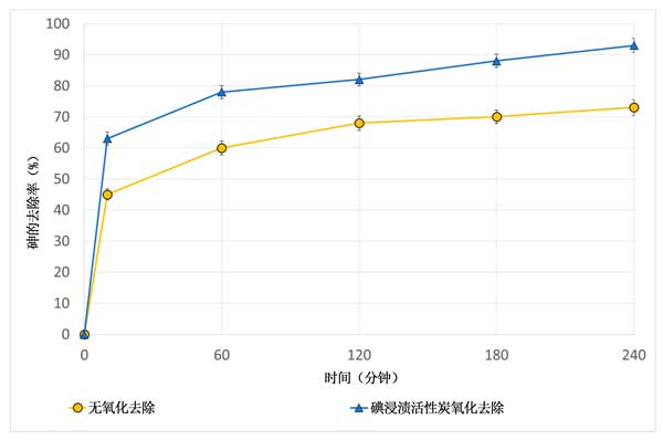 采用分批程序作為測試亞砷酸鹽氧化與砷吸附的整合的第一種方法。批量實驗的條件類似于檢查亞砷酸鹽氧化動力學的條件。將碘浸漬活性炭和鐵浸漬活性炭的量引入加入亞砷酸鹽的地下水(天然不含砷)中并混合4小時。確定碘浸漬活性炭的量是因為氧化實驗表明這樣的量允許亞砷酸鹽在4小時內完全氧化。在10分鐘,1小時3小時和4小時后取樣1ml的等分試樣,通過過濾器過濾并分析總砷。進行相同的實驗,僅在亞砷酸鹽加標地下水中引入鐵浸漬活性炭。分析結果允許計算每個采樣步驟中砷吸附的百分比。碘浸漬活性炭的氧化顯著提高了鐵浸漬活性炭的砷吸附效率(圖4)。
