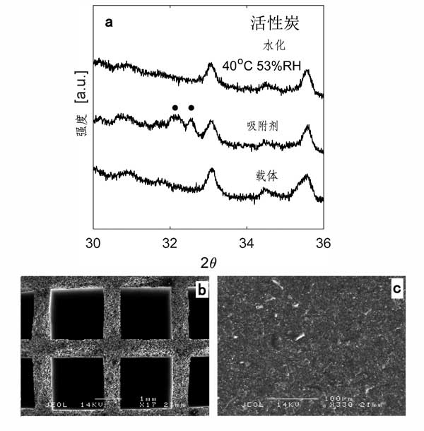 圖1a顯示了在40℃和相對(duì)濕度為53%下水合處理后活性炭載體,吸附劑和活性炭X射線衍射圖。由于碳酸鉀倍半水合物的反射特性的存在證實(shí)了鹽在載體上的負(fù)載。由于載體中加載的鹽量低,解釋了這些反射的低強(qiáng)度,5.58wt%。其余的峰對(duì)應(yīng)于載體中的不同相,例如碳和二氧化硅。圖1b顯示了活性炭載體的SEM照片。如圖中所看到的圖中,信道是正方形幾何形狀的具有每邊1.979±0.006毫米的長(zhǎng)度,并且所述通道之間的壁的厚度是0.651±0.022毫米。圖1c示出了通道的內(nèi)壁的表面上,他們看起來很同質(zhì)。