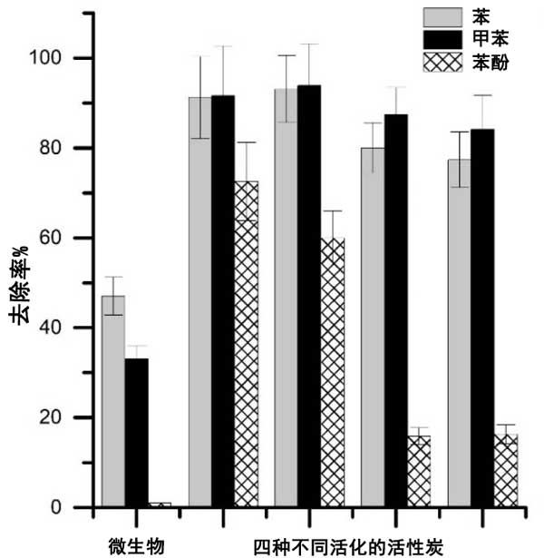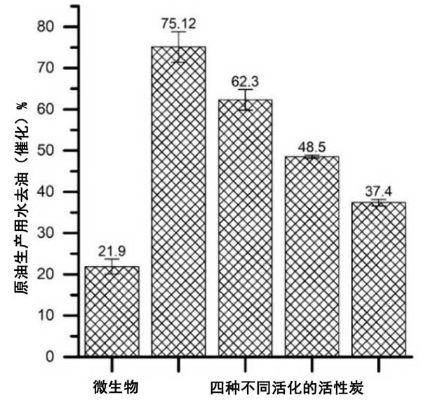 簡(jiǎn)而言之,使用活性炭(60%-93%)和載微生物活性炭(16%-84%)比游離的無(wú)活性炭載體的微生物(1%-47%)更好地去除芳香烴。材料的孔隙率和吸附偶極性有利于吸附。常規(guī)活性炭表現(xiàn)出高度的微孔性,其中可以容納分子量約為100的苯,甲苯和苯酚。活性炭的非極性特征保證了碳?xì)浠衔锏氖杷,也是非極性的;钚蕴筷(yáng)離子表面有利于芳烴保留,因?yàn)榉辑h(huán)中的π電子與表面陽(yáng)離子靜電連接。使用常規(guī)活性炭和載微生物活性炭的原油去除能力如圖3所示。使用游離的微生物和油-鹽水乳液作為對(duì)照。