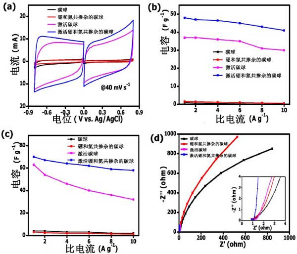 圖3顯示了在中性電解質(zhì)溶液3M KNO 3中,活性炭電極在正和負(fù)工作電位范圍內(nèi)的電化學(xué)分析結(jié)果。碳球和活性炭的相應(yīng)CV曲線(xiàn)呈現(xiàn)出準(zhǔn)矩形形狀,表示特征性的雙電層電容行為(圖3a)。正如預(yù)期的那樣,硼氮摻雜碳的CV曲線(xiàn)形狀比碳球的矩形更加矩形,因此顯示出較小的電阻碳表面。對(duì)碳球和硼氮摻雜碳觀(guān)察到的低電流響應(yīng)歸因于缺乏多孔結(jié)構(gòu),限制了電極和電解質(zhì)界面之間的離子擴(kuò)散和傳輸。相反,活性炭和硼氮摻雜活性炭的電流響應(yīng)由于在碳表面,然后促進(jìn)更好的電解質(zhì)-電極表面相互作用和增強(qiáng)的離子擴(kuò)散進(jìn)入孔隙較高。與未摻雜的碳球相比,硼氮摻雜活性炭由于其高表面積和硼氮和氧雜原子的存在而產(chǎn)生很高的電流響應(yīng)。