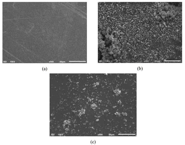 進(jìn)行SEM以研究材料的形態(tài)。圖1顯示了放大率為500x的殼聚糖膜(圖1a),活性炭(圖1b)和活性炭殼聚糖復(fù)合膜(圖1c)的SEM圖像;钚蕴康钠骄綖0.7μm(圖4b)。殼聚糖膜的表面與活性炭殼聚糖復(fù)合膜的表面相比是光滑的,這是由于復(fù)合膜中存在活性碳。活性炭在殼聚糖膜中的分布由圖證實(shí)。它還證實(shí)了殼聚糖薄膜覆蓋了活性炭。