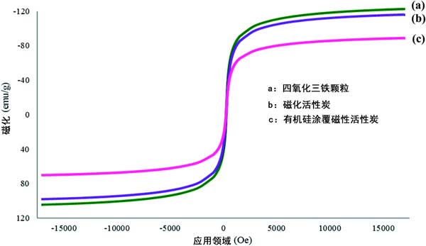 在這項(xiàng)研究中使用VSM來(lái)檢查合成活性炭的磁強(qiáng)度。對(duì)Fe 3 O 4顆粒,磁性活性炭和機(jī)硅涂覆磁性活性炭進(jìn)行了研究,以研究它們?cè)谕扛矔r(shí)的磁強(qiáng)度趨勢(shì)。幾種材料的磁滯回線分別示于圖1(a)-(c)。根據(jù)獲得的結(jié)果。由于存在非磁性活性炭和有機(jī)硅表面活性劑涂層,磁強(qiáng)度似乎下降了。這確認(rèn)涂覆過(guò)程成功。但是,盡管在涂覆最終材料機(jī)硅涂覆磁性活性炭時(shí)磁化強(qiáng)度降低,但其磁強(qiáng)度仍在可接受的范圍內(nèi),并且強(qiáng)度足以在吸附過(guò)程中進(jìn)行。