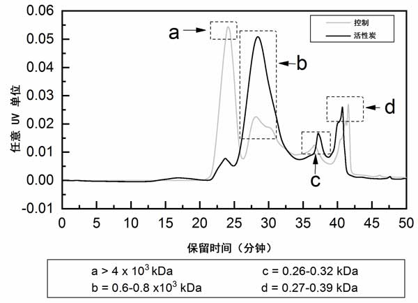 為了檢驗(yàn)活性炭改變可溶性微生物組成,使其對(duì)膜具有更高的親和力這一假設(shè),通過(guò)GPC分析了構(gòu)成可溶性微生物的有機(jī)分子的大小分布(圖1)。在第二次可溶性微生物運(yùn)行結(jié)束時(shí)收集了可溶性微生物樣品(圖1b),有趣的是,GPC色譜圖顯示了對(duì)照反應(yīng)堆和活性炭加入反應(yīng)堆之間的明顯差異。在活性炭反應(yīng)器的可溶性微生物中,保留時(shí)間為24分鐘時(shí),來(lái)自對(duì)照反應(yīng)器的可溶性微生物的第一個(gè)峰顯著降低,而在活性炭反應(yīng)器的可溶性微生物中,在28分鐘時(shí)觀察到峰的上升(圖1,分別是峰值a和b);钚蕴糠磻(yīng)器的可溶性微生物中的37分鐘處的峰也升高(峰c)?扇苄晕⑸镏心承┯袡C(jī)化合物含量的變化(升高或降低)可能歸因于,由于微生物群落組成的變化或某些活性炭所觀察到的代謝活性增強(qiáng),導(dǎo)致某些微生物產(chǎn)品的產(chǎn)生和分泌增加另外,或抑制進(jìn)水橄欖油廢水中物質(zhì)的降解。有機(jī)化合物對(duì)活性炭顆粒的吸附只會(huì)降低其在可溶性微生物中的外觀。由于吸附到活性炭上,可溶性微生物中某些成分的減少(如峰a所示)也有可能優(yōu)先吸附其他成分,這些成分對(duì)通量的減少更不利,或者起膜調(diào)節(jié)前體的作用,這可能會(huì)增強(qiáng)生物膜的生長(zhǎng)(例如峰b–d)。顯然,確定膜上有機(jī)污染物的身份是一項(xiàng)必不可少的任務(wù),目前,尚不清楚不同可溶性微生物組分對(duì)膜污染的詳細(xì)影響以及它們被活性炭的吸附。