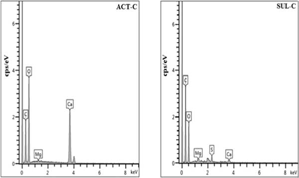 各種尺寸的活性炭和磺化炭的SEM圖像形態(tài)如圖1所示。。ACT-C和SUL-C催化劑的SEM圖像表明,白點代表無機成分。從圖像可以看出,活性炭具有不規(guī)則的致密結(jié)構(gòu),而顆粒看起來像具有光滑表面的顆粒。圖2顯示了ACT-C和SUL-C催化劑的EDX圖,并觀察到SUL-C圖中存在硫。此外,在ACT-C和SUL-C的圖中,還有一些額外的峰涉及雜質(zhì),因為碳源是廢物生物質(zhì),因此可能存在這些雜質(zhì)。如圖3所示,通過TEM分析了活性炭和磺化炭的形態(tài)和結(jié)構(gòu)。該TEM圖像ACT-C催化劑的“A”表示僅存在微孔,而SULC催化劑則顯示了“微孔”和“中孔”,這是由于活性炭材料上的磺化作用所致,在活性炭材料中產(chǎn)生了中孔。