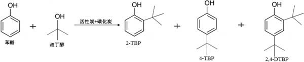 將合成的激活和磺化的活性炭被用于通過苯酚烷基化噸丁基醇。所得產(chǎn)物為2-TBP,4-TBP和2.4-TBP。在圖4中給出了通過叔丁醇使苯酚烷基化的反應(yīng)方案。在90-160 °C的溫度范圍內(nèi)苯酚向單烷基化和二烷基化產(chǎn)物的轉(zhuǎn)化率,并且發(fā)現(xiàn)對于兩種合成的催化劑,在低溫下轉(zhuǎn)化率都非常低,但隨著溫度的升高而降低。增加,苯酚的轉(zhuǎn)化率一直增加到140 ℃。在本研究中合成的活性炭和磺化炭催化劑表明有希望的催化功能。苯酚的最大轉(zhuǎn)化率在140 °C時達(dá)到。溫度的進(jìn)一步升高導(dǎo)致苯酚轉(zhuǎn)化率降低,這可以歸因于較高溫度下烷基化和脫烷基反應(yīng)的熱力學(xué)。此外,這還可能與以下事實有關(guān):在更高的溫度下,開始發(fā)生數(shù)個平行反應(yīng),這些反應(yīng)在叔丁醇脫水導(dǎo)致的副反應(yīng)中消耗烯烴,例如低聚,烷基化和裂解?梢钥隙ǖ氖,高溫下裂紋占主導(dǎo)地位,但這會導(dǎo)致苯酚轉(zhuǎn)化率下降。