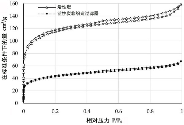 活性炭和負(fù)載活性炭的非織造過(guò)濾器的氮吸附(下部分支)/脫附(上部分支)等溫線如圖3所示。
