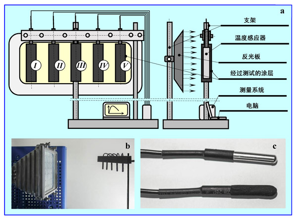 圖1:用紅外輻射測量被測涂層的加熱和冷卻時(shí)間。(a)測量站的示意圖,(b)反射鏡和支架的視圖,(c)不帶涂層和帶涂層的溫度傳感器。